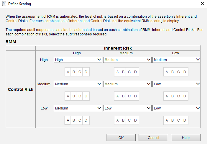 • If the Inherent and Control risk columns are included, the proposed RMM value of the Entity level and IT general weaknesses and controls row is based on the Defined RMM Scoring dialog