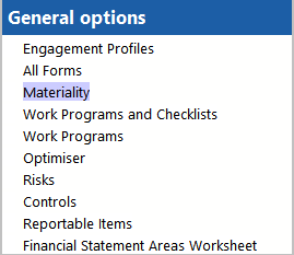As the Firm Author, you can set the materiality terminology used in the file. You can also specify whether the preliminary and final materiality values are to be displayed at the top of each form in client files generated from your template. You can also set the file to calculate performance materiality based on a specified percentage.