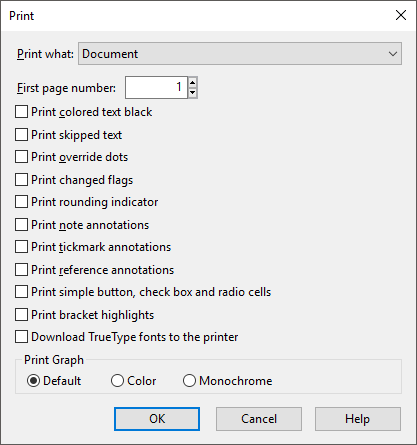 Set the starting page number, then select the elements of the document that you want to include in the printed output. If the document contains any charts or graphs, you can override the color scheme if required.
