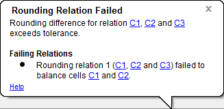 If a rounding relation fails, a notification dialog will display with a list of all the rounding errors. Use this dialog to locate, review and fix the errors.