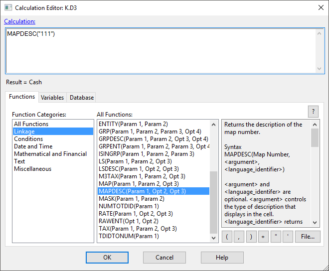 The MAPDESC function links the description of a map number from the accounting database in Working Papers or Time. To link a map number description automatically, create a new alphanumeric cell (the description being linked is alphanumeric) and enter the calculation.