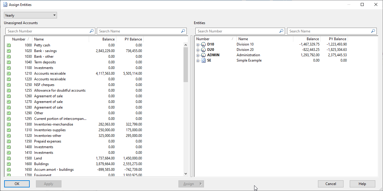 If your entities trial balances are located internally within the Caseware file (as in this example), you can use Caseware’s Account > Assign Entities function to assign the accounts to the required entities.