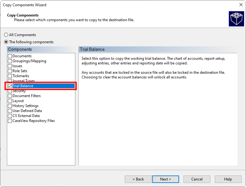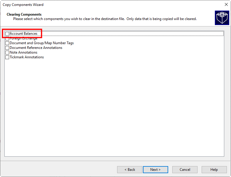A trial balance can be copied from one file to another. If you are copying a trial balance from an existing file, click to check Account Balances in the Clearing Components section on the next window. This will bring in a trial balance with all the existing account properties (including assigned map numbers) into the new file but without the account balances.