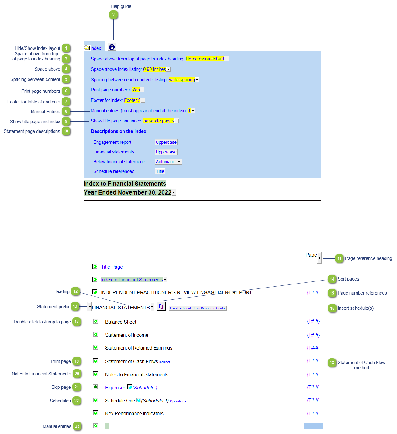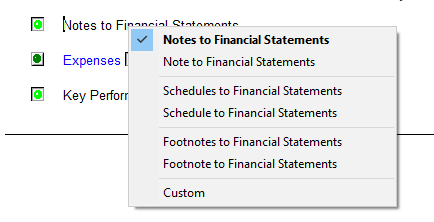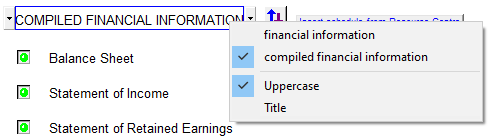 The heading can be skipped by selecting the blank option from the popup menu. This way your Table of Contents will show as a continuous list. Right-click on the description for more formatting options. The 'financial information' option is available when the FS is set to Compilation in the Engagement section of the Home menu. This setting is shared with the Title Page.