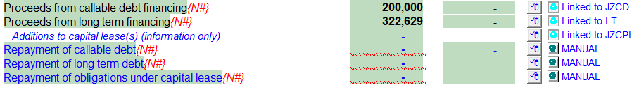 The Statement of Cash Flow pulls the balances from a number of Jazzit working papers. This is indicated by the Linked to [WPID] reference seen to the right of the row. If you are not using a Jazzit working paper, you can change the row to indicate that the balance has been manually entered by clicking on the blue button. This will disconnect the link to the Jazzit working paper and the description will change to Manual. Use the input cells to manually enter the balances. Click on the green button to link the row to the Jazzit working paper again if desired. If the linked Jazzit working paper is not present in a file, the CF will automatically switch the line to Manual.