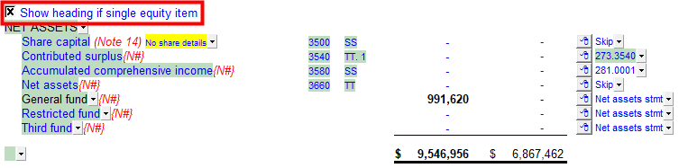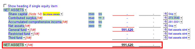 When the net assets is set to print as a single line (see above) and no other net asset items are shown, the heading will skip and only the net asset total will print. You can set the heading to print by checking Show heading if single equity item checkbox.