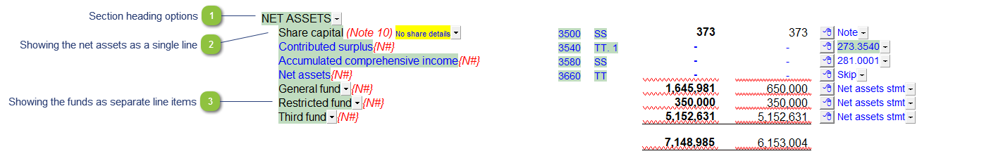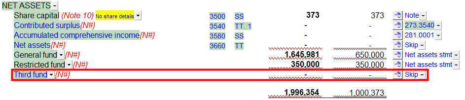 The funds can be shown as separate line items on the Statement of Financial Position (this is the default setting). The popup menu to the right will either set the row to pull from the Statement of Net Assets or make it skip. This options is available when using Format B (2-year with % Statement Format).