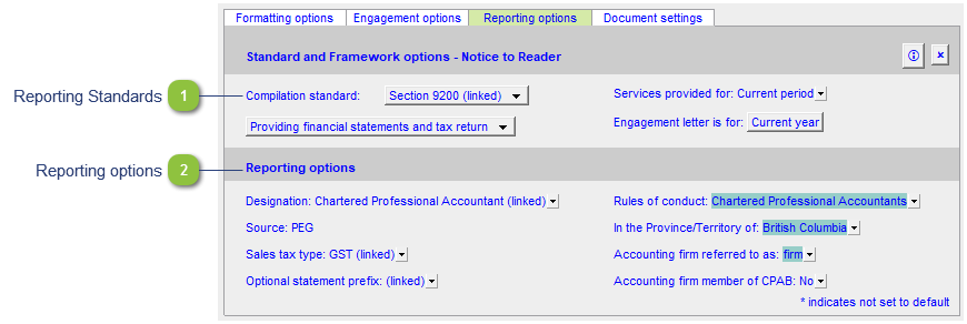 This area is linked to the engagement options and engagement report options of the Jazzit financial statements. Options available will change based on compilation type. |