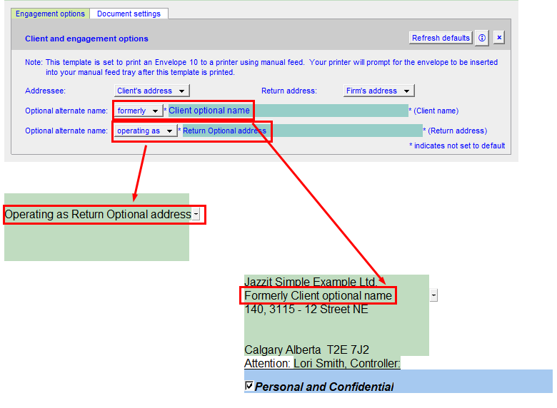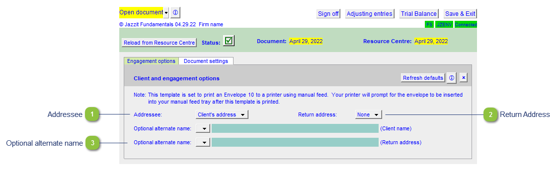 Client address automatically populates the addressee area from the engagement properties. You can also have the firm address populate this area if you are creating a pre-printed return envelope. |