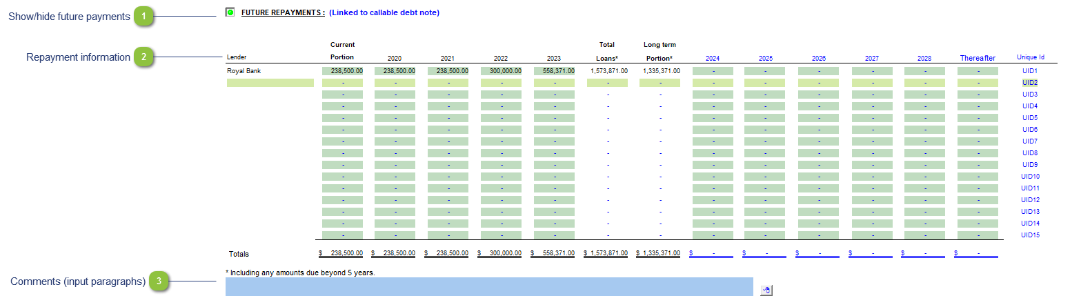 Click on the green radio button to show or hide the future repayments section. Switching this section off does not affect the Repayments section in the accompanying note. |