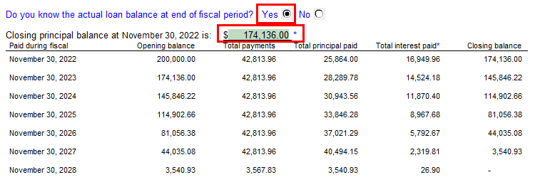 Select Yes if you know the actual loan balance at the end of the fiscal period. This will open another section to allow you to enter the closing principal balance. All relevant tables will be recalculated accordingly.