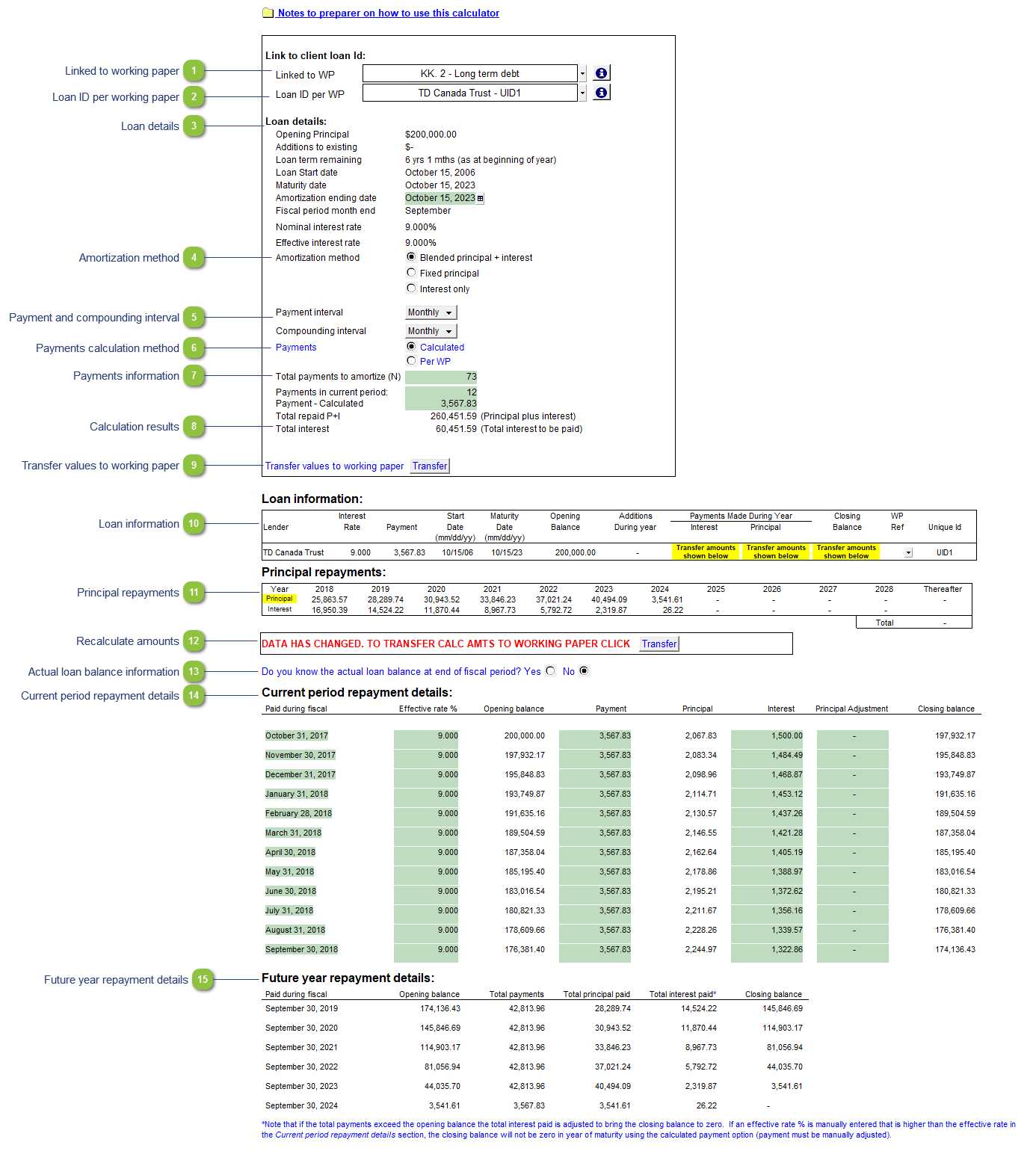 A summary of the loan information is shown at the bottom of the calculation. This is transferred from the linked loan in the linked working paper. Yellow cells indicate that the balance needs to be transferred to the linked working papers. |