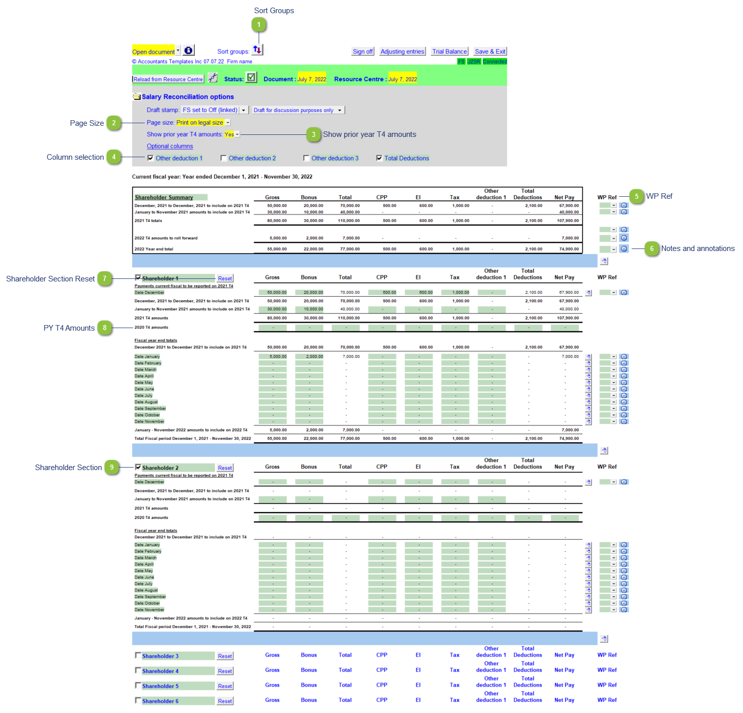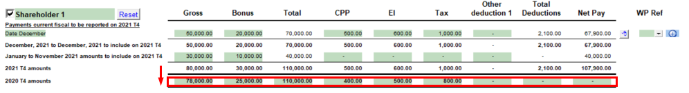 Show or hide the row that shows the prior year T4 amounts in each shareholder section. Any amount can be entered into this row because they are input cells. Amounts from the current year row will roll into this row when the Caseware file is rolled forward.