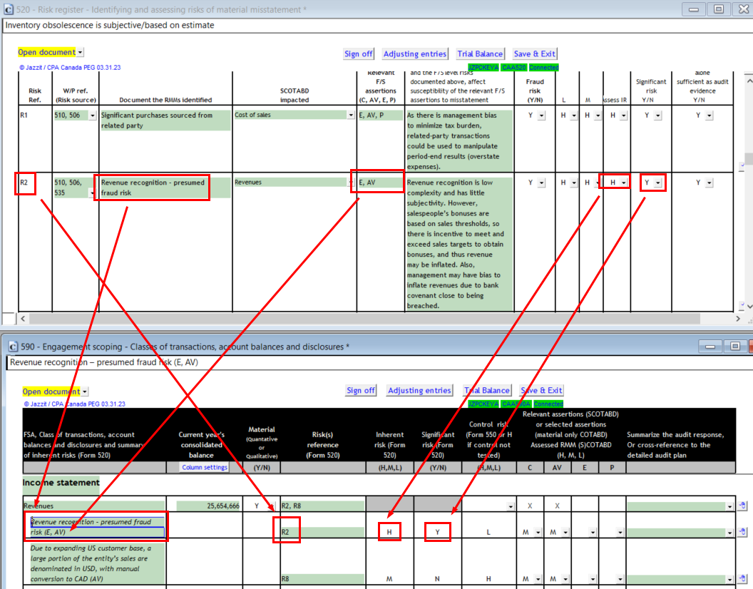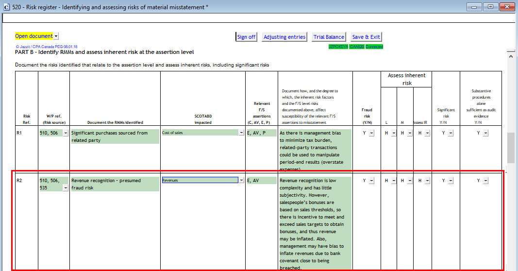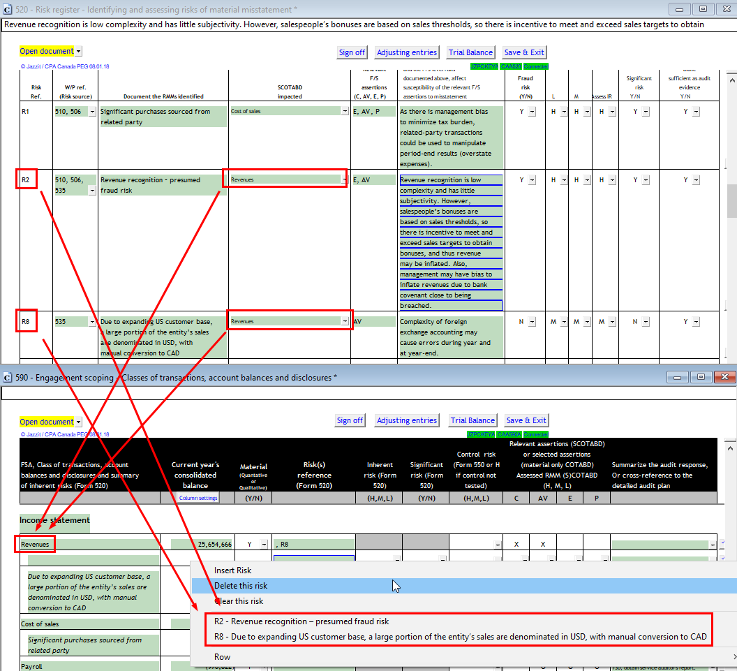 Enter an RMM (assertion level) in Part B of checklist 520. In the R2 risk the SCOTABD is set to Revenues. This determines the F/S area in checklist 590 that this RMM is accessible. Customized SCOTABD can be typed in.