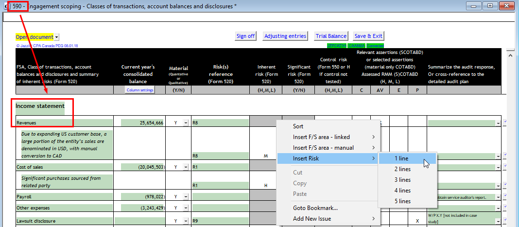 In checklist 590 scroll to the F/S area entitled Revenues under the Income Statement area. Right-click on the Revenues line to insert a risk under the Revenues F/S area.