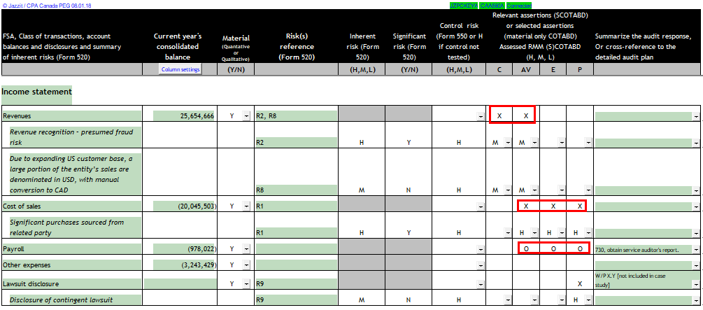 "O"s will automatically populate for an F/S area where no risks are identified. This will automatically become "X"s when a RMM is associated with an F/S area. This applies to both RMMs linked from 520 and RMMs entered manually.